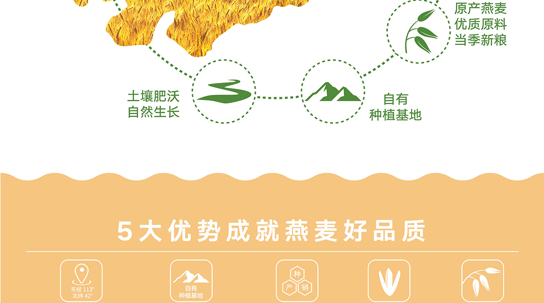 內(nèi)蒙古,世界裸燕麥起源地之一;陰山源生燕麥在初出生滿足生長(zhǎng)規(guī)律一切所需,高寒、高海拔、日照充足;遵循自然法則,靠天滋養(yǎng),自然生長(zhǎng);