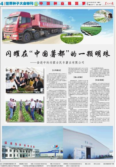 2014年5月27日,農(nóng)民日?qǐng)?bào)世界種子大會(huì)特刊以 “中國(guó)種業(yè)強(qiáng)國(guó)夢(mèng)” 為主題刊登了《閃耀在“中國(guó)薯都”的一顆明珠——奮進(jìn)中的民豐薯業(yè)有限公司》一文。