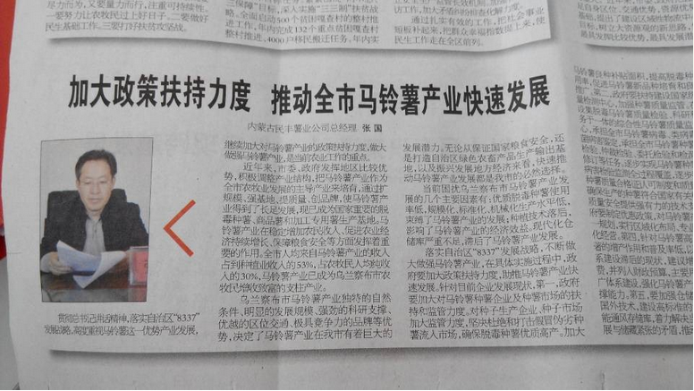 張國表示,民豐薯業(yè)將堅(jiān)定貫徹總書記講話精神,落實(shí)自治區(qū)“8337”發(fā)展戰(zhàn)略,充分發(fā)揮龍頭企業(yè)帶動、幫扶作用,為推動我市馬鈴薯產(chǎn)業(yè)快速發(fā)展做出新貢獻(xiàn)。