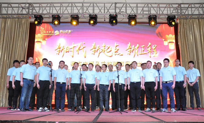 大會以播放短片的形式回顧了公司一年來的各項業(yè)務(wù)發(fā)展情況和取得的成績。副總經(jīng)理邰志東代表公司首先向全體人員致辭,而后在察右中旗烏蘭牧騎《時代贊歌》、《守望相助》的歌舞里拉開序幕。頒獎環(huán)節(jié),由22名優(yōu)秀行政管理人員、生產(chǎn)管理人員、生產(chǎn)服務(wù)人員、銷售人員和14個最佳效益獎、最佳質(zhì)量獎、最佳合作伙伴獎、優(yōu)秀團(tuán)隊獎、董事長特別獎的獲獎代表上臺接受了公司各級領(lǐng)導(dǎo)的頒獎和祝賀。同時,原種生產(chǎn)管理中心、脫毒組培中心、原種生產(chǎn)管理中心、物流倉儲中心用《民豐之歌》和《民豐我們的家》兩首大合唱表達(dá)了對公司的贊美和熱愛之情。最后,大會在烏蘭牧騎《在你偉大的懷抱里》的舞蹈里走向高潮。表彰大會和文藝演出穿插進(jìn)行,環(huán)環(huán)相扣,方式新穎,得到了全體員工的一致好評,也為即將開始的新春生產(chǎn)種植工作注入了活力,帶來了動力。